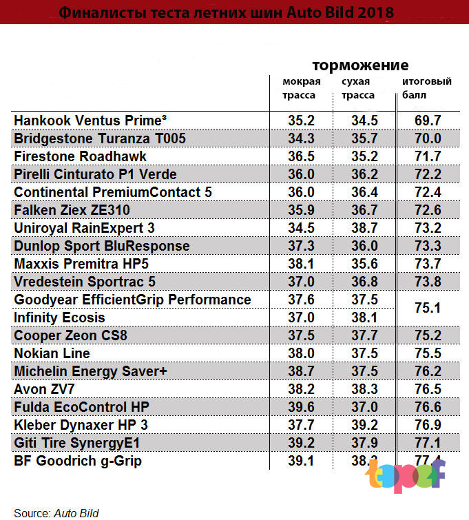 В «элитную» группу попали шины Hankook Ventus Prime3, Bridgestone Turanza T005 и Firestone Roadhawk. Кроме того, в двадцатку лидеров тестов на торможение вошли Pirelli Cinturato P1 Verde, Conti PremiumContact 5, Falken Ziex ZE310, Uniroyal RainExpert 3, Dunlop Sport BluResponse, Maxxis Premitra HP5, Vredestein Sportrac 5, Goodyear EfficientGrip Performance, Infinity Ecosis, Cooper Zeon CS8, Nokian Line (xLine), Michelin Energy Saver+, Avon ZV7, Fulda EcoControl HP, Kleber Dynaxer HP 3, Giti SynergyE1 и BFGoodrich g-Grip. Результаты этих испытаний Auto Bild планирует опубликовать в начале весны.